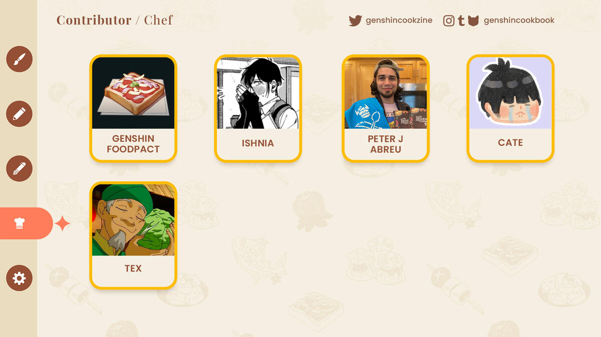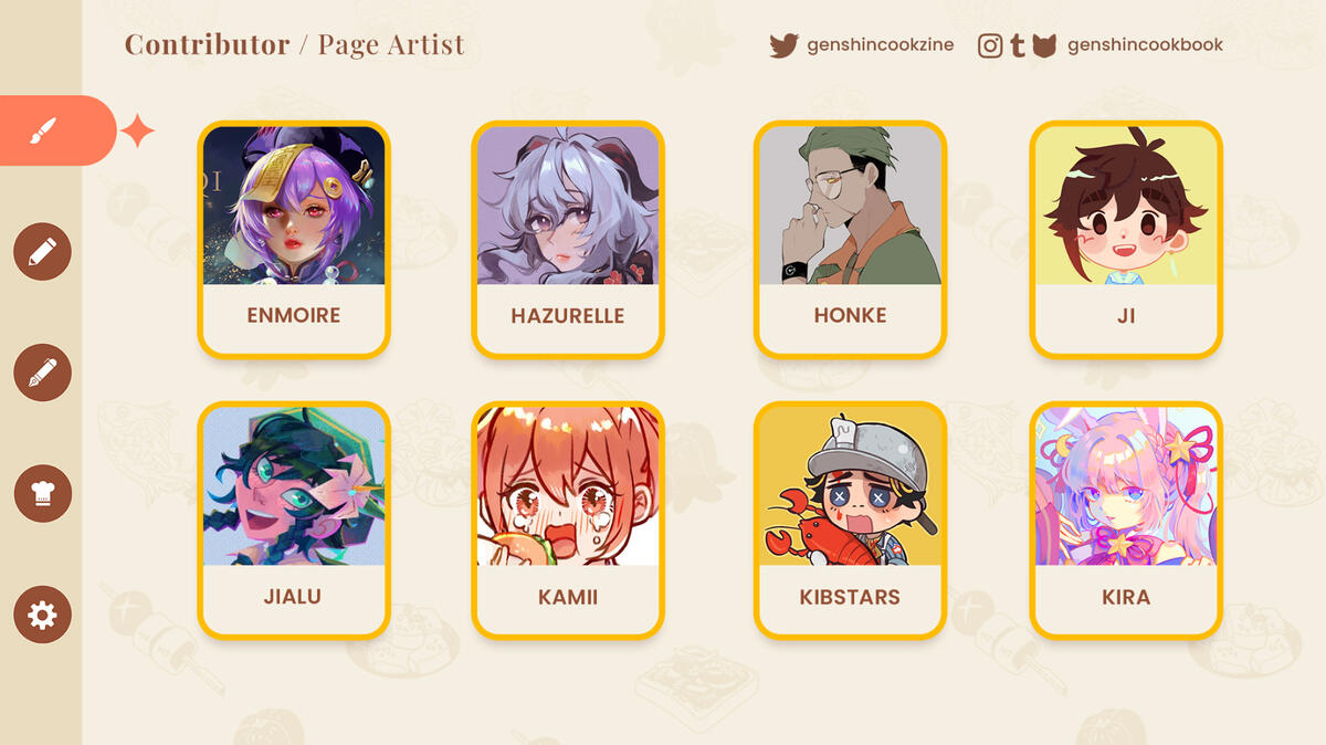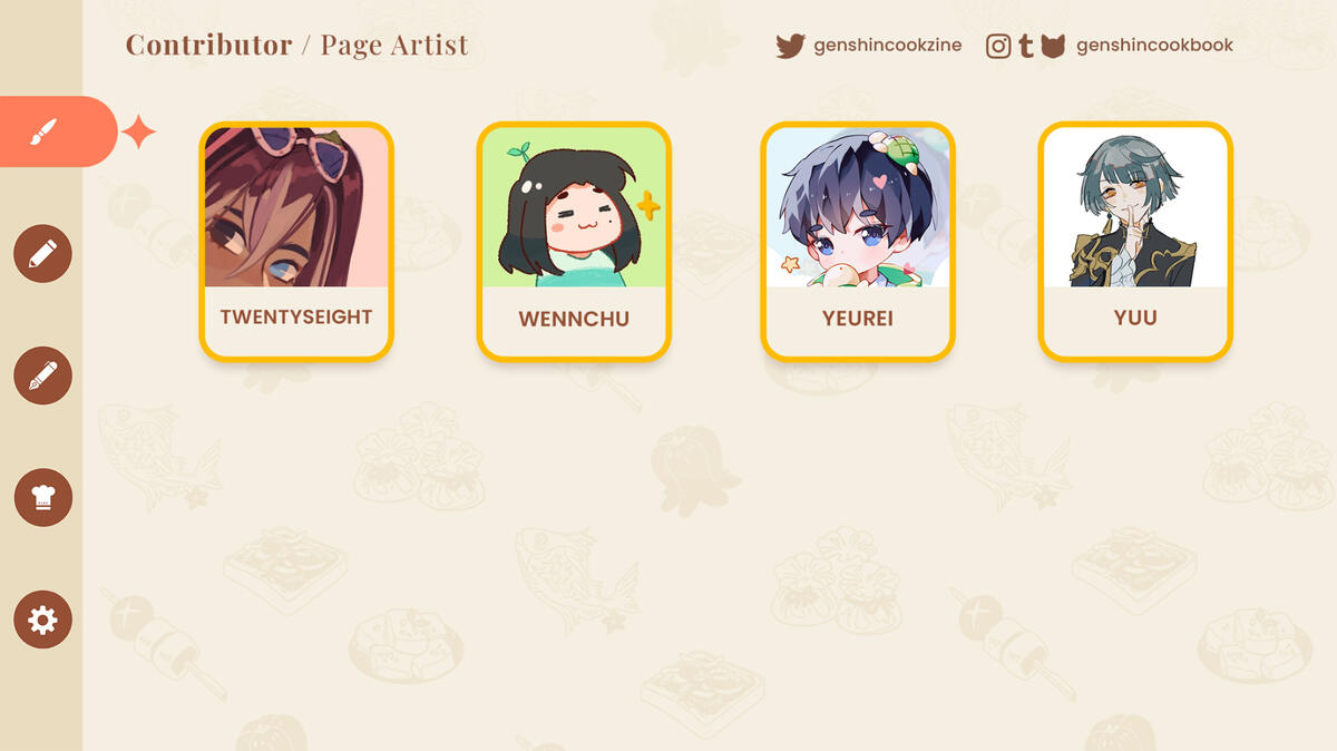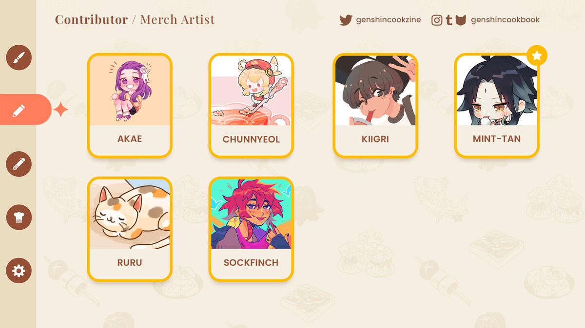 Find more information about applying hereChefs are expected to come up with four (4) recipes in total, according to the nation(s) they're assigned to. At least 1 recipe should be an original dish, and at least 2 recipes should be character’s specialties (i.e. Razor’s Puppy-Paw Hash Brown, Xingqiu’s Countryside Delicacy).Artists are expected to create one (1) full illustration to accompany an assigned recipe/fic. They may also be assigned up to two (2) spot illustrations.Merch Artists are expected to create several types of merch assigned to them.Writers are expected to create one (1) fic according to the nation/characters they’re assigned to.Q: Can I apply for more than one position?