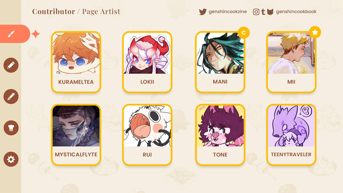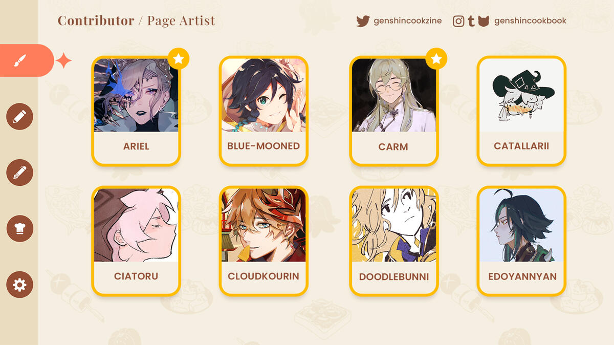 Find more information about applying hereChefs are expected to come up with four (4) recipes in total, according to the nation(s) they're assigned to. At least 1 recipe should be an original dish, and at least 2 recipes should be character’s specialties (i.e. Razor’s Puppy-Paw Hash Brown, Xingqiu’s Countryside Delicacy).Artists are expected to create one (1) full illustration to accompany an assigned recipe/fic. They may also be assigned up to two (2) spot illustrations.Merch Artists are expected to create several types of merch assigned to them.Writers are expected to create one (1) fic according to the nation/characters they’re assigned to.Q: Can I apply for more than one position?